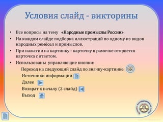 Документ представляет собой презентацию о народных промыслах России, подробно освещая различные виды народного творчества, такие как филимоновская, дымковская и богородская игрушки, а также различные росписи и керамику. Каждый слайд включает иллюстрации и дополнительные сведения о каждом промысле, с использованием интерактивных элементов для перехода между слайдами. Презентация стремится продемонстрировать богатство и разнообразие русского прикладного искусства.