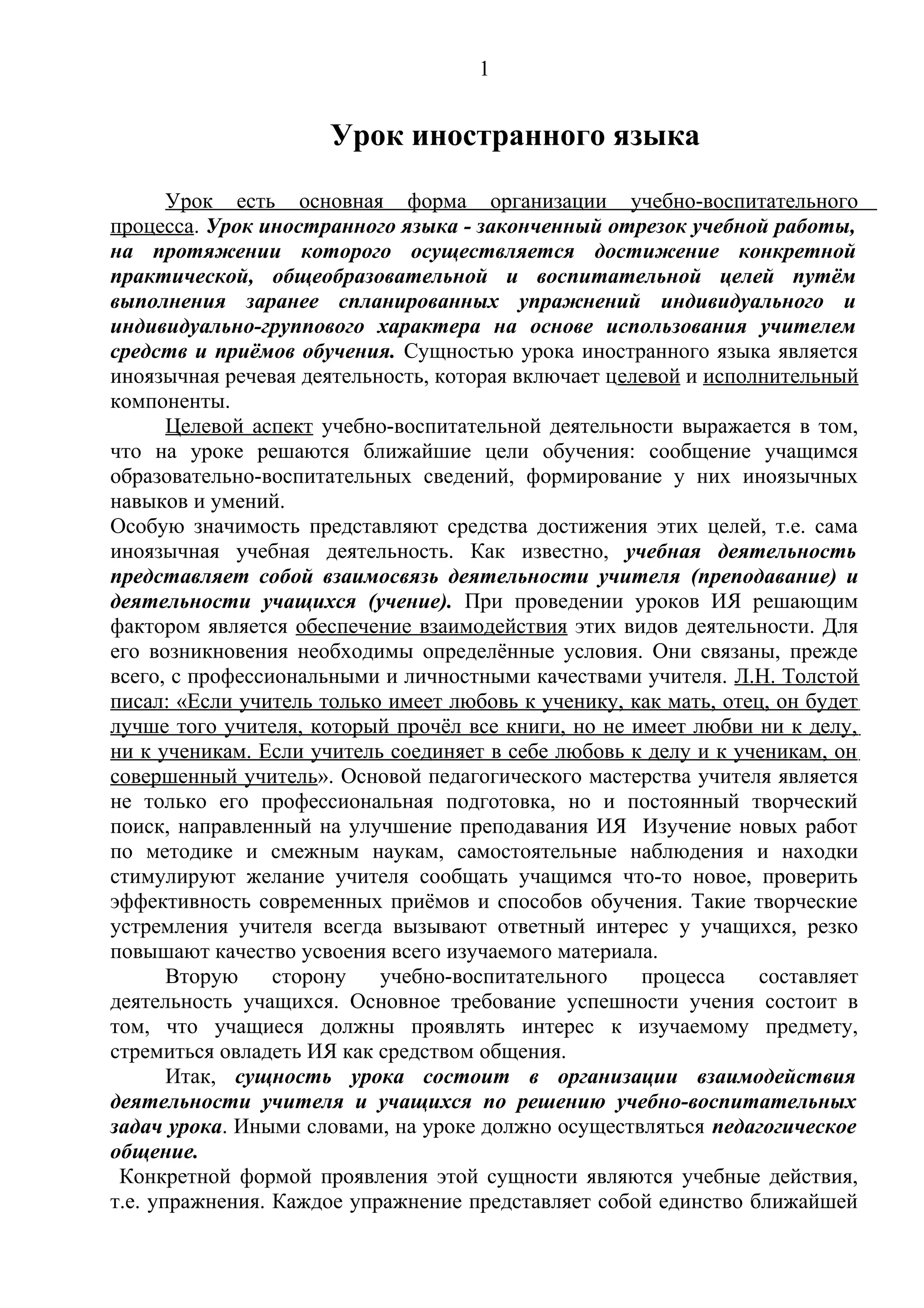 Документ описывает сущность и структуру урока иностранного языка, акцентируя внимание на взаимодействии деятельности учителя и учащихся в процессе обучения. Основное внимание уделяется методическим подходам, этапам уроков, типам и видам упражнений, а также требованиям к профессионализм teacher's. В документе подчеркивается значимость методов преподавания и важность создания атмосферы иноязычного общения для достижения образовательных целей.