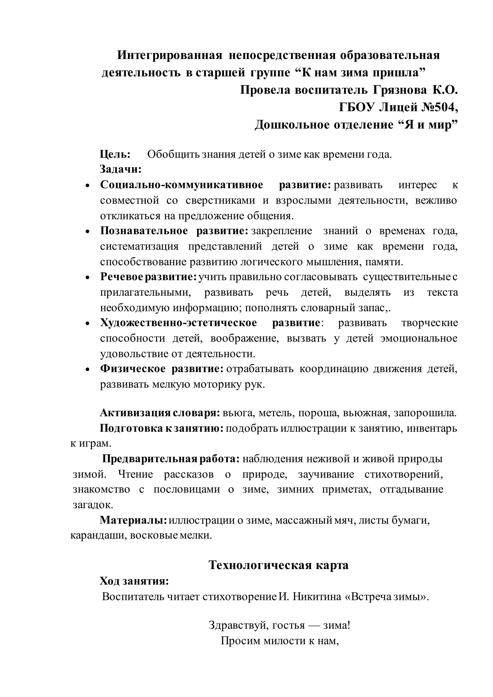 Воспитатель провел интегрированное занятие для старшей группы на тему зимы, целью которого было обобщение знаний детей о зиме. Занятие включало различные виды деятельности: обсуждение, игры, чтение стихов и занятия по развитию речи и логического мышления. В процессе занятия дети изучали явления природы зимой, обсуждали зимние праздники и занятия, а также выполняли творческую работу.