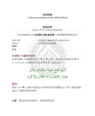 of Nūr Wālā Cheĥraĥ • 版版版版权权权权所有所有所有所有 版权 © 2013 马克塔巴•图•麦地那 没有出版商以外马马马马克塔巴克塔巴克塔巴克塔巴•图图图图•麦麦麦麦地那地那地那地那不得转载或再现这本书 出版日期: 闪瓦鲁月, 1434 回历年 (2013年8月) 出版社: 马克塔巴•图•麦地那 ISBN: 数量: 研研研研读读读读教教教教门书门书门书门书籍的祈籍的祈籍的祈籍的祈祷词祷词祷词祷词 在研读教门书籍或者学习教门课之前,先诵念下面的祈祷词, اﻟَﺂء َﺷ ْنِاــﻪﻠَّﻞَﺟَوَّﺰَﻋ ,你便会牢牢记住你所学习到的知识。 ۡ ُ ۡ اَو َ َ َ ۡ ِ َ ۡ َ َ ۡ َ ۡ ا ُ َ ا ا َ ذ ـَ َ َ َ ۡ َر َ ۡ َ َ امَ! ۡ "ِ ۡ #اَو ِل َ %َ ۡ &ا 意思意思意思意思 安拉 َّﻞَﺟَوَّﺰَﻋ 啊!求你为我们打开你的知识和智慧的大门吧!和你慈悯 我们!至尊至贵的主啊! 注意注意注意注意::::诵念此祈祷词前后,皆要念赞圣辞.
