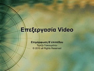 Οι γνωστότεροι MPEG codecs MPEG-1 MPEG-1, PAL, 352x288, 25 fps, CBR (Constant bitrate) 1.150 kbits/sec MPEG-1 Audio Layer II, 44100Hz, Stereo, 224kbits/sec MPEG- 4 Αποδοτικότερη συμπίεση με πολύ καλή ποιότητα. Codecs DivX - XviD - Microsoft MPEG-4 Video CD MPEG-2 MPEG-2, PAL, 480x576, 25 fps CBR ή VBR 1.600 έως 2520 kbits/sec MPEG-1 Audio Layer II, 44100Hz, Stereo, 224kbits/sec Super Video CD Ποιότητα VHS Ποιότητα SVHS MPEG-2, PAL, 720x576, 25 fps CBR ή VBR 700 έως 9200 kbits/sec MPEG-1 Audio Layer II, 48000Hz, Stereo, 64- 384kbits/sec ή ή Dolby Digital (AC-3), 48000Hz, 6 ch , 128-448kbits/sec ή ή Linear PCM, 48000Hz, Stereo, 1536kbits/sec DVD Ποιότητα BETA 8 γλώσσες – 9 κάμερες – 32 υπότιτλοι 2 γλώσσες – 4 υπότιτλοι