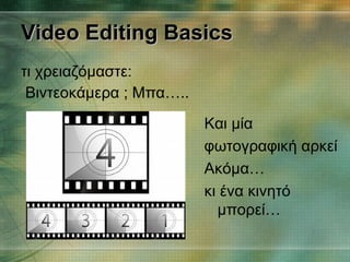 Video Editing Basicsτι χρειαζόμαστε: Βιντεοκάμερα ; Μπα….. Και μία φωτογραφική αρκεί Ακόμα… κι ένα κινητό μπορεί…