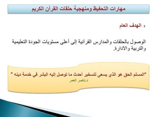 تهدف الوثيقة إلى تحسين جودة تعليم وتحفيظ القرآن من خلال دورات مخصصة تهتم بتطوير المعلمين والطالب. تتناول الفروق بين التحفيظ والتدريس، وتعرض منهجية فعالة للحفظ، مع التركيز على الأهداف التعليمية وتوفير بيئة مثالية. كما تشمل مقترحات لتوزيع الحفظ على مدى الزمن والعوامل المؤثرة على نجاح الطلاب.