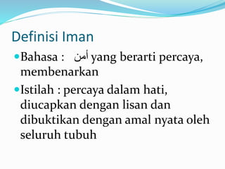 Dokumen ini membahas tentang pengertian iman, termasuk definisi dalam bahasa dan istilah, serta jenis-jenis iman yang meliputi iman kepada Allah, malaikat, kitab-kitab, para rasul, hari akhir, dan takdir. Setiap jenis iman memiliki konsekuensi yang mengharuskan individu untuk taat, berusaha, serta mempersiapkan diri untuk pertanggungjawaban di akhirat. Iman juga dapat bertambah melalui ketaatan dan berkurang akibat maksiat.