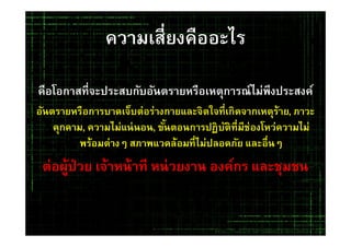ความเสี่ยงเกิดจากอะไร เรามักตั้งคำถามกันเสมอยามเมื่อเกิดความเสี่ยงขึ้น ประเด็นหลักที่เรานำมาพิจารณาเป็นอันดับแรกหรือหลังก็ขึ้นอยู่กับว่าองค์กรนั้นเน้นการแก้ไขแบบใด ถ้าเน้นที่ตัวบุคลก็จะแก้ที่ตัวบุคคลคือ ตำหนิและกล่าวโทษ แน่นอนสิ่งที่เกิดขึ้นตามมาคือความเสี่ยงมีโอกาสที่จะเกิดขึ้นซ้ำ และการค้นหา และรายงานความเสี่ยงจะไม่ได้รับความร่วมมือ ทำให้การบริหารจัดการความเสี่ยงเดินไปไม่ได้ แต่ถ้าองค์กรใดเน้นที่ตัวระบบมากกว่าตัวบุคล การบริหารจัดการความเสี่ยงก็จะเป็นที่ยอมรับ และความปลอดภัยจะเกิดขึ้นอย่างยั่งยืน เอกสารชุดนี้เป็นการบอกเล่าถึงปัจจัยที่ก่อให้เกิดความเสี่ยงเพื่อที่เราจะได้ตระหนัก และเข้าใจในสิ่งที่เกิดขึ้น ซึ้งจะนำมาสู่ความปลอดภัยแก่ผู้ป่วย ผู้รับบริการอื่นๆ เจ้าหน้า องค์กร และชุมชนอย่างยั่งยืนครับ