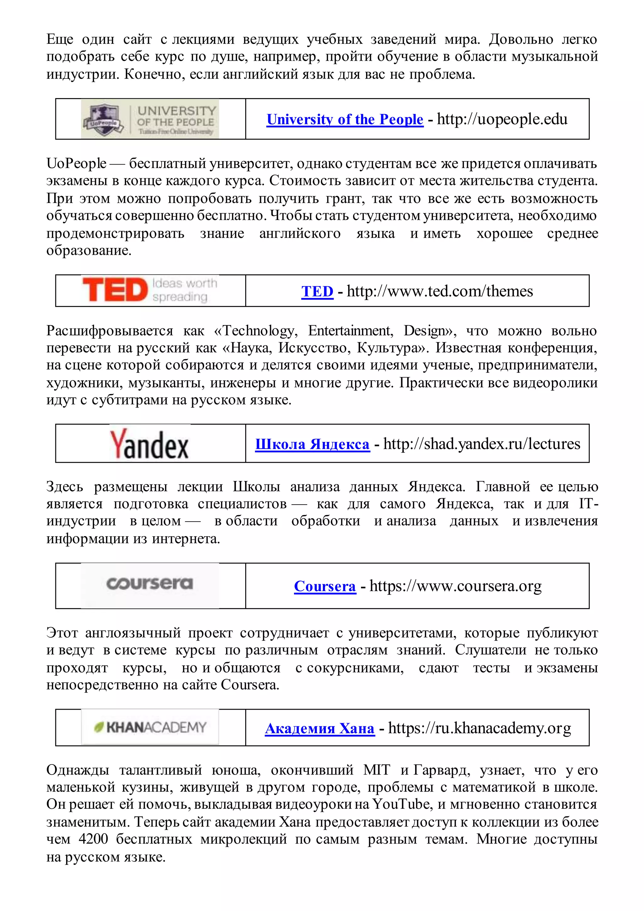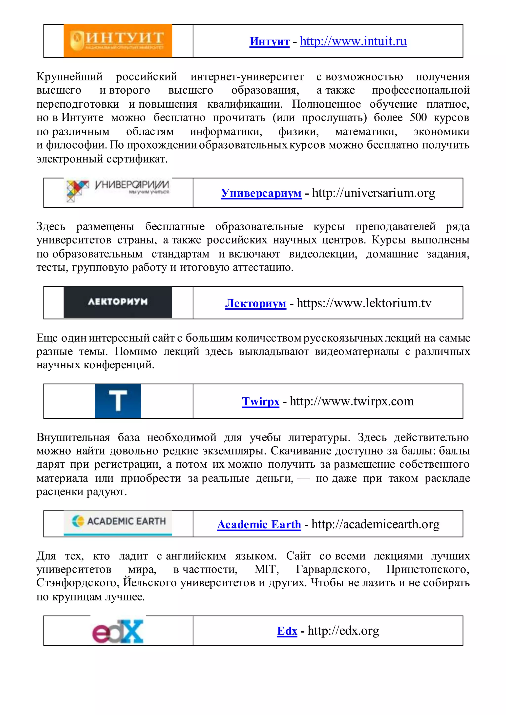 Документ описывает различные онлайн-образовательные платформы, предлагающие бесплатные и платные курсы по множеству дисциплин, включая Интуит, Универсариум, Лекториум и Coursera. Также упоминаются ресурсы, такие как TED и Академия Хана, которые предоставляют доступ к лекциям и образовательным материалам. В целом, документ подчеркивает доступность качественного образования через интернет.