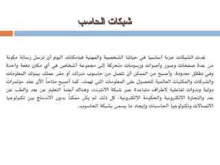 الوثيقة تتناول أساسيات شبكات الحاسب، بما في ذلك تعريفها ومكوناتها وفوائدها، بالإضافة إلى أنواع الشبكات مثل الشبكات المحلية والإنترانت والإكسترانت. كما تشرح التفاصيل عن الخوادم والعملاء والمصادر المشتركة، وتتناول أيضًا بروتوكولات نقل البيانات وتطبيقات استخدام الشبكات في مجالات مثل البنوك وقواعد البيانات الموزعة. تبرز الوثيقة أهمية تصميم الشبكات والتحديات المرتبطة بها، مع مقارنة بين الهياكل المختلفة للشبكات.