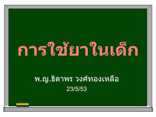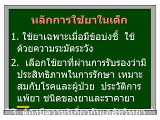 ยาระบาย Magnesium hydroxideMilk of magnesium Age < 2 yr : 0.5 ml/kg/day, 2-5 yr : 5-15 ml/day Age 6-12 yr : 15-30 ml/day, > 12 yr : 30-60 ml/day PO OD-bid SE : ปวดท้อง , hypermagnesemia in renal failure