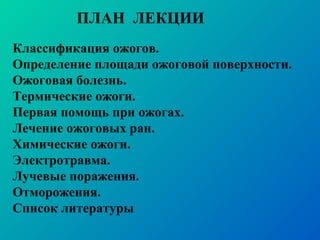 Документ представляет собой лекцию по ожогам, охватывающую классификацию, методы первой помощи и лечение различных типов ожоговых ран. Классификация ожогов разбита на термические, химические, электрические и лучевые, с описанием их характеристик по степеням глубины поражения. Особое внимание уделяется ожоговой болезни, её стадиям и протоколам лечения, включая методы реабилитации и применения трансплантатов кожи.