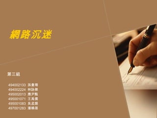 该文档探讨了网络沉迷对高中生的影响,指出网络沉迷是一种冲动控制失常,并分析了其分类、成因以及社会影响。研究发现,高中生的消遣动机和性别可作为网络沉迷的预测因素,且低自尊和抑郁倾向的学生更易沉迷。建议通过适当的教育策略和支持体系,帮助学生解决网络沉迷问题。