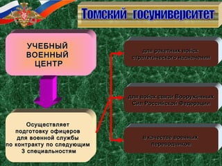 Учебный военный центр Томского государственного университета готовит офицеров для военной службы по контракту по специальностям для ракетных войск и войск связи, а также для военных переводчиков. Обучение длится 5-5,5 лет и включает в себя как теоретические занятия, так и практическую подготовку на военной технике. Выпускники получают диплом о высшем образовании, а также воинское звание "лейтенант" и социальные гарантии, предусмотренные для военнослужащих.