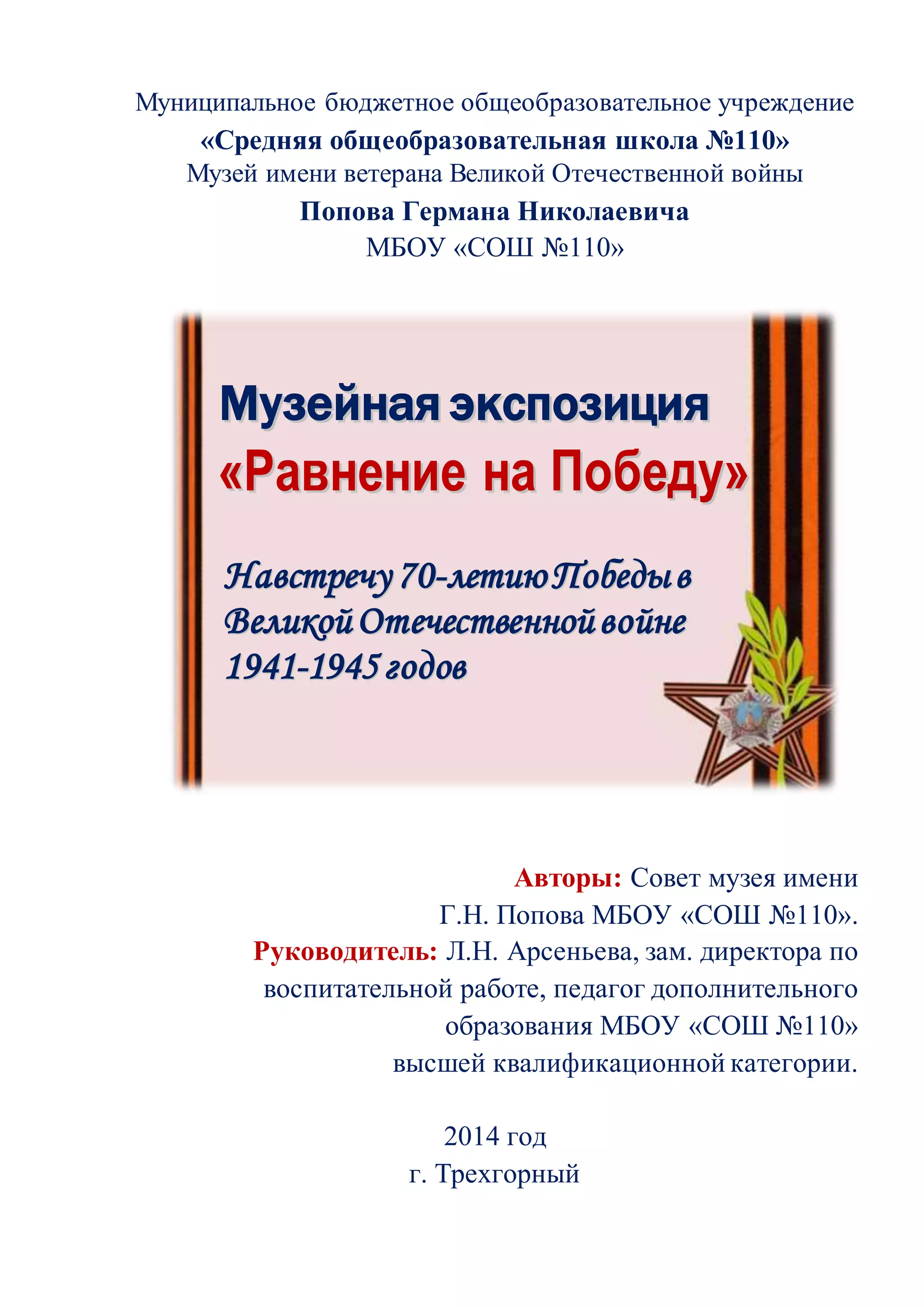 Документ описывает музей имени ветерана Великой Отечественной войны Германа Николаевича Попова, расположенный в средней общеобразовательной школе №110, и его экспозицию 'Равнение на победу', посвященную памяти событий и участников войны. Экспозиция включает разнообразные артефакты, документы и материалы, которые активно используются в воспитательной работе и образовательных мероприятиях для учащихся, а также направлена на патриотическое воспитание. Также освещены исторические моменты создания музея и его значимость для местного сообщества.