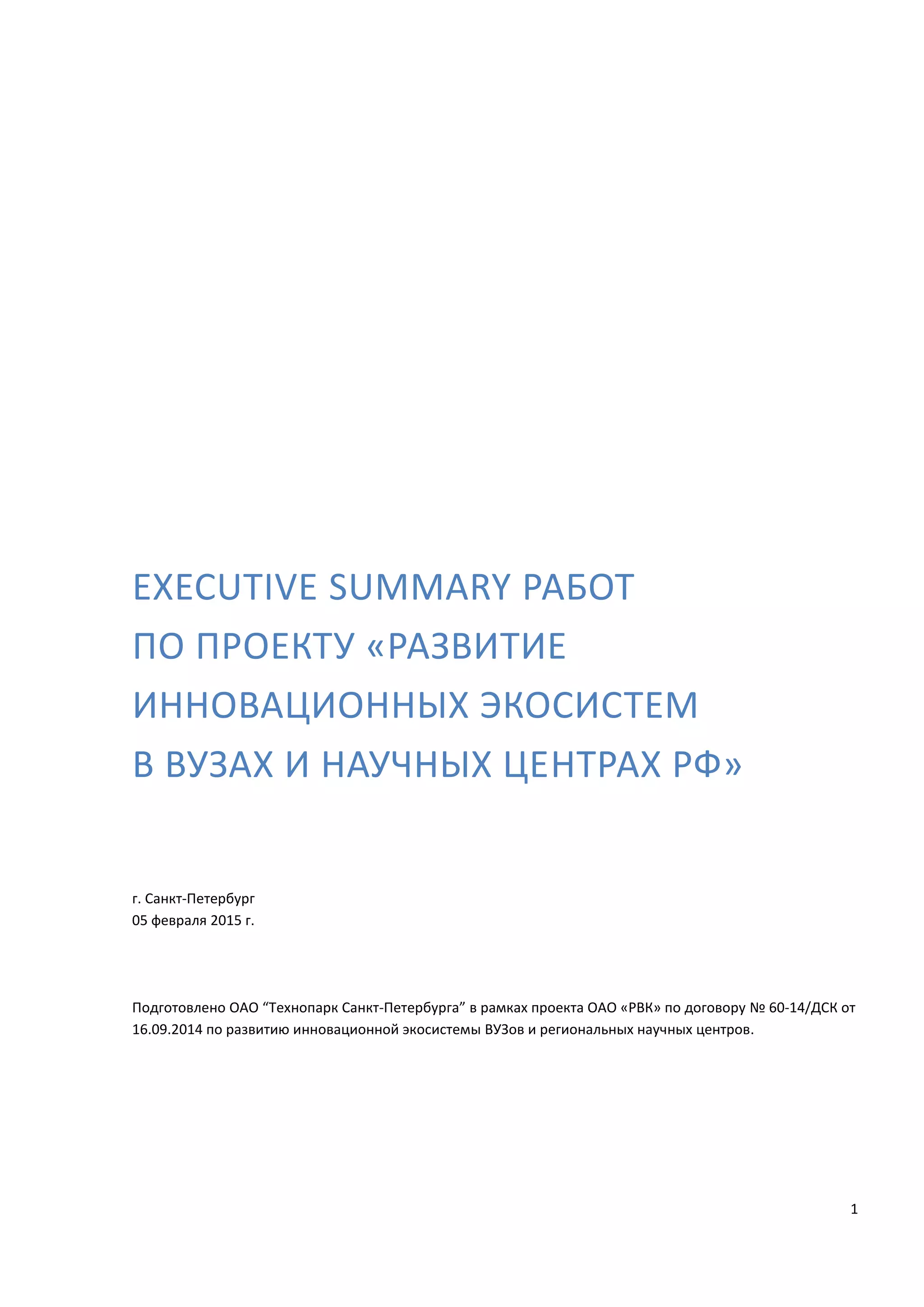 Документ представляет собой исполнительное резюме проекта по развитию инновационных экосистем в российских вузах и научных центрах, подготовленное ОАО 'Технопарк Санкт-Петербурга'. Основная цель проекта заключается в содействии вузам и научным организациям в трансфере технологий и компетенций, а также в решении проблем, связанных с разрывом коммуникаций между разработчиками и индустрией. Ожидаются как краткосрочные, так и долгосрочные результаты, включая повышение вовлеченности и качества взаимодействия между вузами и промышленностью.