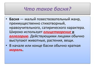 Документ описывает басню как литературный жанр, акцентируя внимание на её характерных чертах: олицетворении, аллегории и морали. Рассматриваются знаменитые баснописцы, такие как Эзоп и Иван Андреевич Крылов, а также приводятся примеры известных басен и их смысл. В тексте делается акцент на значении басни как средства нравоучения и сатиры.