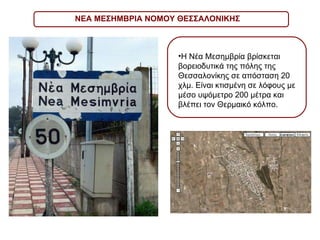 Η Νέα Μεσημβρίαβρίσκεται βορειοδυτικά της πόλης της Θεσσαλονίκης σε απόσταση 20 χλμ. Είναι κτισμένη σε λόφους με μέσο υψόμετρο 200 μέτρα και βλέπει τον Θερμαικό κόλπο. ΝΕΑ ΜΕΣΗΜΒΡΙΑ ΝΟΜΟΥ ΘΕΣΣΑΛΟΝΙΚΗΣ
