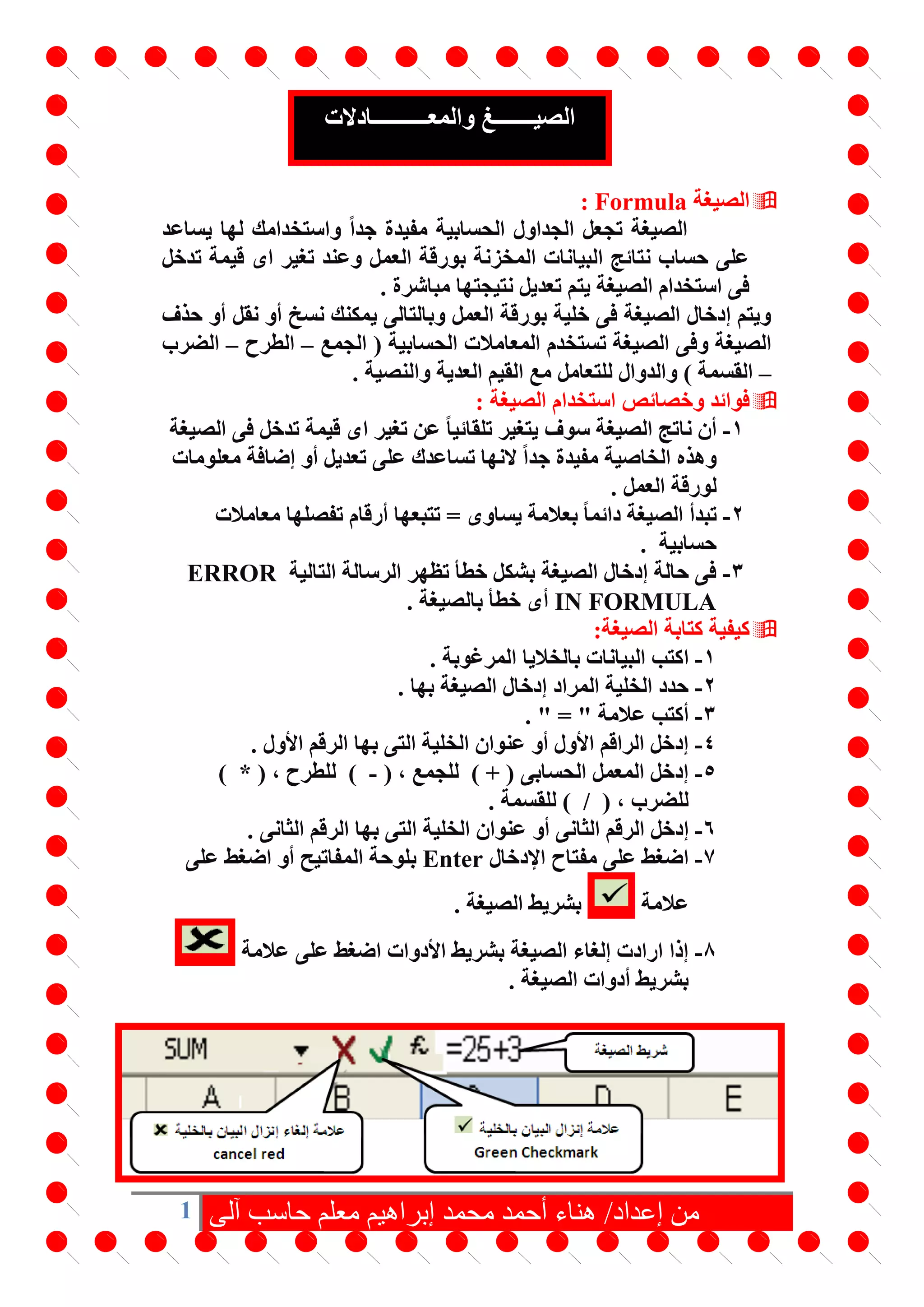 يتناول الوثيقة كيفية استخدام الصيغ في برنامج إكسل، حيث يتم توضيح كيفية الدخول إلى الصيغ وتعديلها وخصائصها. كما يتضمن الشرح كيفية استخدام الدوال الرياضية مثل الجمع والطرح والضرب والقسمة، مع توضيح أولوية العمليات الحسابية. أخيراً، يتم ذكر كيفية حساب المتوسط، وأعلى وأدنى قيمة باستخدام دوال محددة في إكسل.