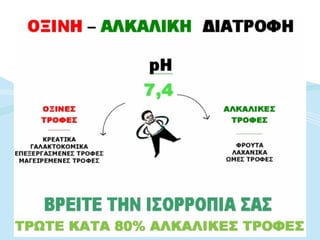 ΤΟ PH ΤΟΥΑΙΜΑΤΟΣ Κλίμακα σημαίνει ότι το pH 6 είναι 10 φορές περισσότερο οξύ από το pH 7. Όλες οι ζωντανές ουσίες έχουν ένα pH, και επίσης μια βέλτιστη κλίμακα του pH. Η κλίμακα του pH του αίματος είναι 7,3 - 7,45 για την ανθρώπινη ζωή. Πιο όξινοι από 7,3 πεθαίνουμε. Πιο βασικοί από 7,45 πεθαίνουμε. ΟΞΙΝΟ 1-2-3-4-5-6-7 -8-9-10-11-12-13-14 ΒΑΣΙΚΟ