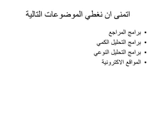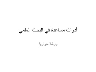 تتناول الورشة موضوع أدوات الحوارية البحث العلمي، حيث تغطي مجموعة من البرامج التكنولوجية المستخدمة في التحليل الكمي والنوعي. تشمل الأدوات مثل Mendeley، EndNote، NVivo، وSPSS، بالإضافة إلى مواقع إلكترونية مثل Google Scholar وSurveyMonkey. الورشة تهدف إلى تعزيز الفهم واستخدام هذه الأدوات في البحث العلمي.