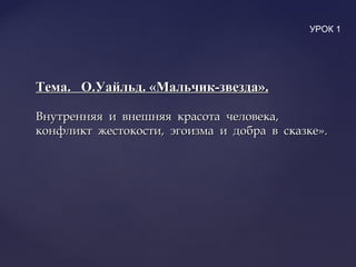 Документ обсуждает сказку Оскара Уайльда "Мальчик-звезда", акцентируя внимание на внутренней и внешней красоте человека, а также конфликте между добром и жестокостью. В документе рассматриваются особенности персонажей и их изменения в ходе повествования. Также представлены задания для учебной работы, связанные с анализом и иллюстрацией сказки.