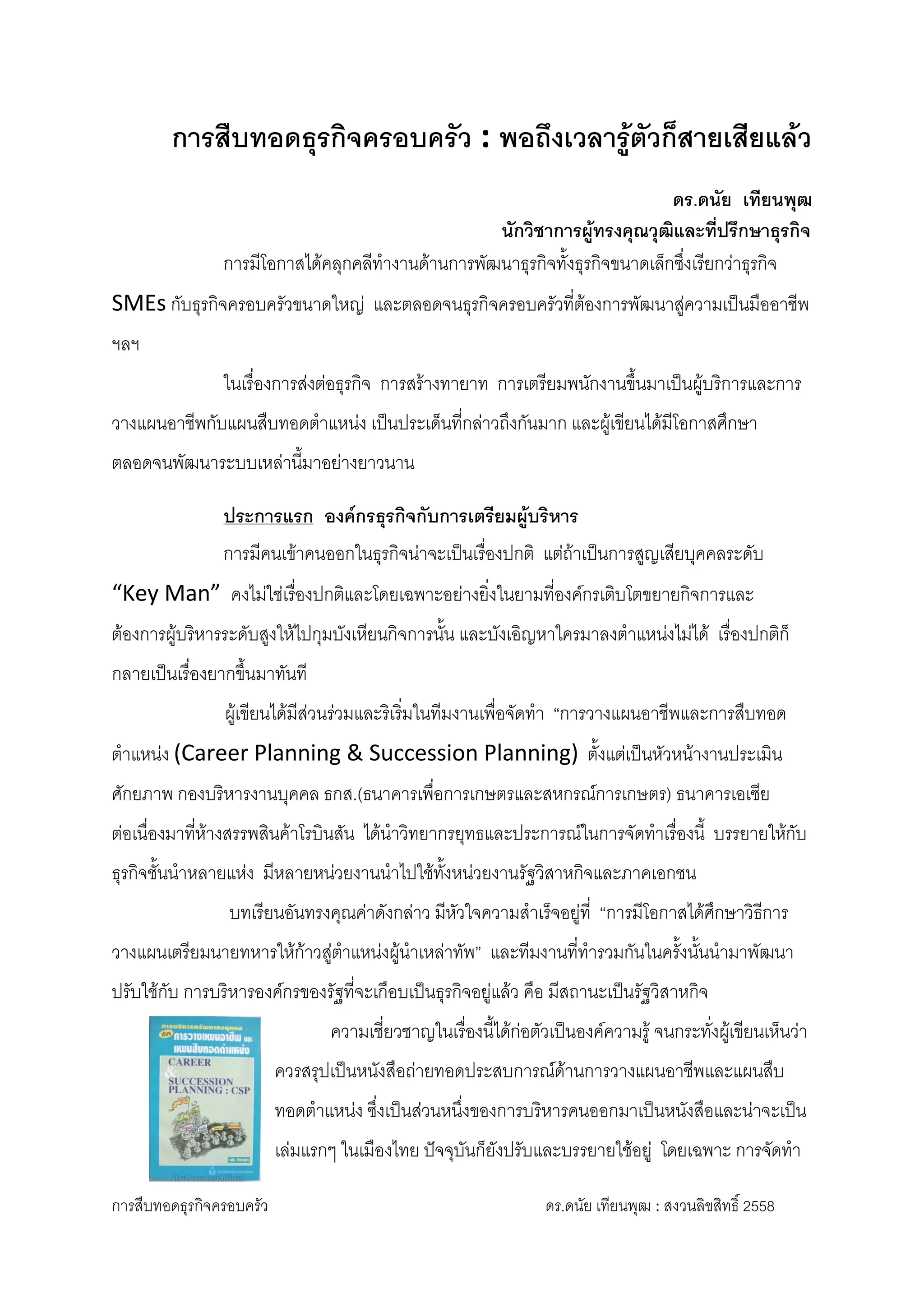 หัวใจสำคัญในเรื่องนี้ ผู้เขียนชี้ชัดไว้ว่า “การทำแผนสืบทอดตำแหน่ง (Succession Plan) สำหรับการสร้างทายาทหรือผู้สืบทอดตำแหน่ง (Successor)“ ในธุรกิจโดยเฉพาะธุรกิจครอบครัวเมื่อต้องการพัฒนาเป็นธุรกิจขนาดใหญ่ จะต้องมีการจัดทำการวางแผนสืบทอดตำแหน่ง