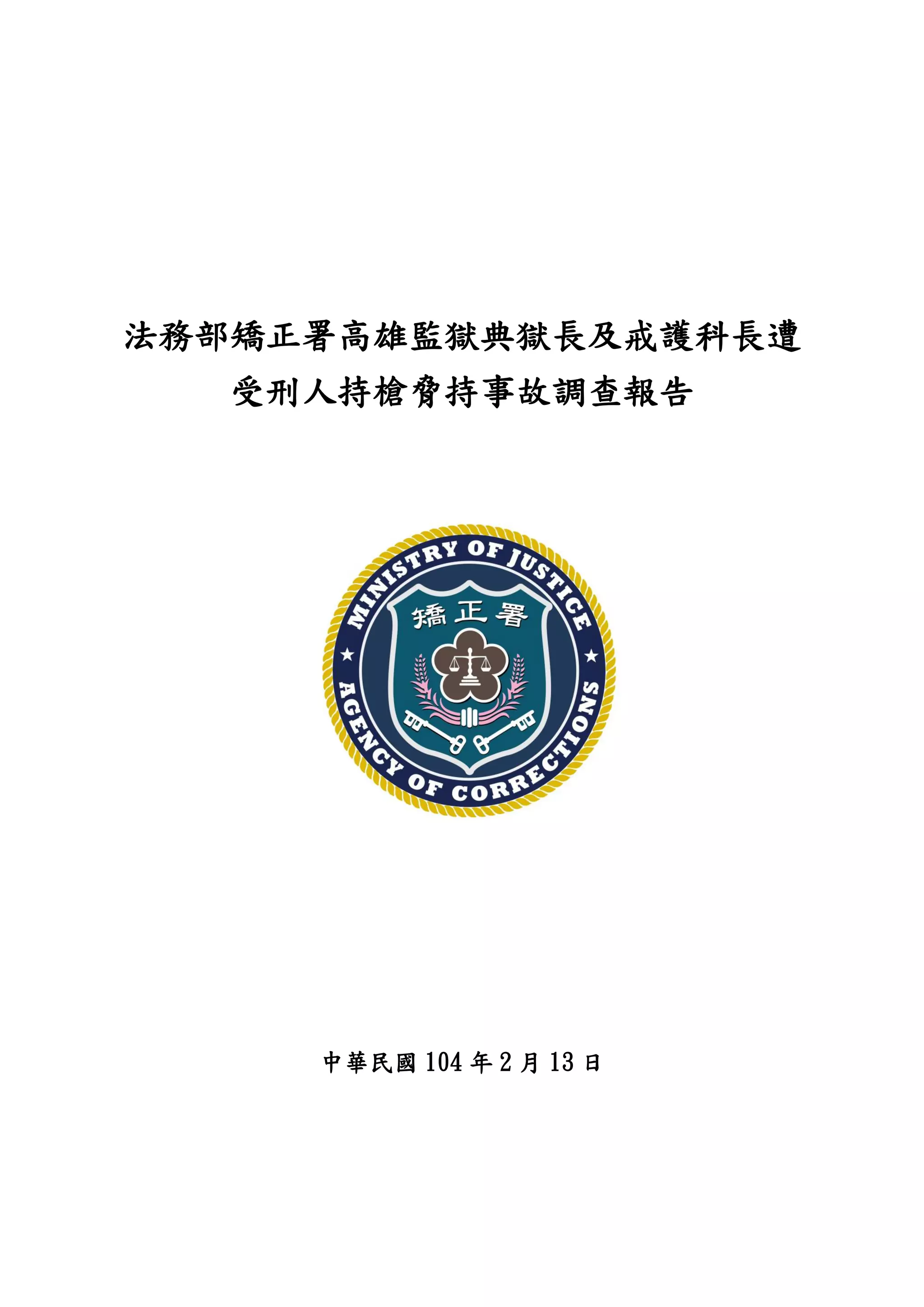 该文档记录了高雄监狱内一起持枪劫持事件的调查报告,事件发生于2015年2月11日至12日,涉及多位重犯在就医期间利用剪刀袭击监狱管理人员并劫持人质。事件经过导致监狱武器库被打开,劫持者试图逃逸,但最终在警方及监狱方的谈判和协调下,事件得以控制。报告细致描述了受刑人的背景、事件经过以及处理过程中的关键决策。