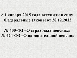 Документ описывает изменения в пенсионном обеспечении россиян с 2015 года, включая вступление в силу новых федеральных законов, касающихся страховых и накопительных пенсий. Основное внимание уделяется расчету пенсионных баллов, условиям назначения страховой пенсии и правилам, связанным с трудовым стажем и заработной платой. Указывается, что для получения пенсии необходимо наличие определенного стажа и пенсионного коэффициента, а также описаны особенности, такие как индексация и права работающих пенсионеров.