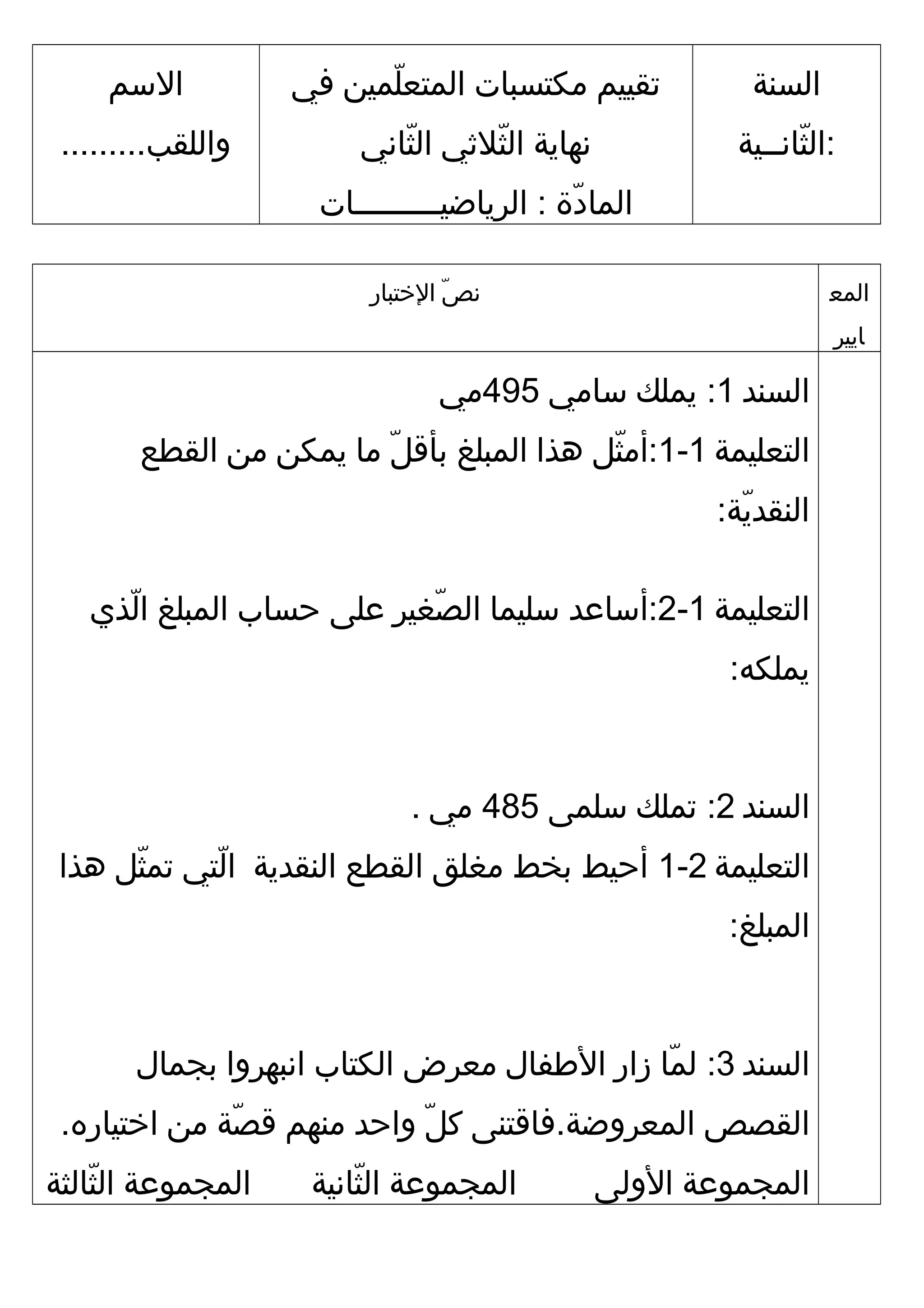 يتضمن المستند تقييم مكتسبات الطلاب في النشاطات التعليمية المتعلقة بالقطع النقدية والمعرض الفني. يقدم التعليمات للطلاب لحساب مبالغ الشراء المتبقية لهم بعد الشراء. كما يتناول تفاعل الطلاب مع الفنون والتعبير من خلال الرسم.