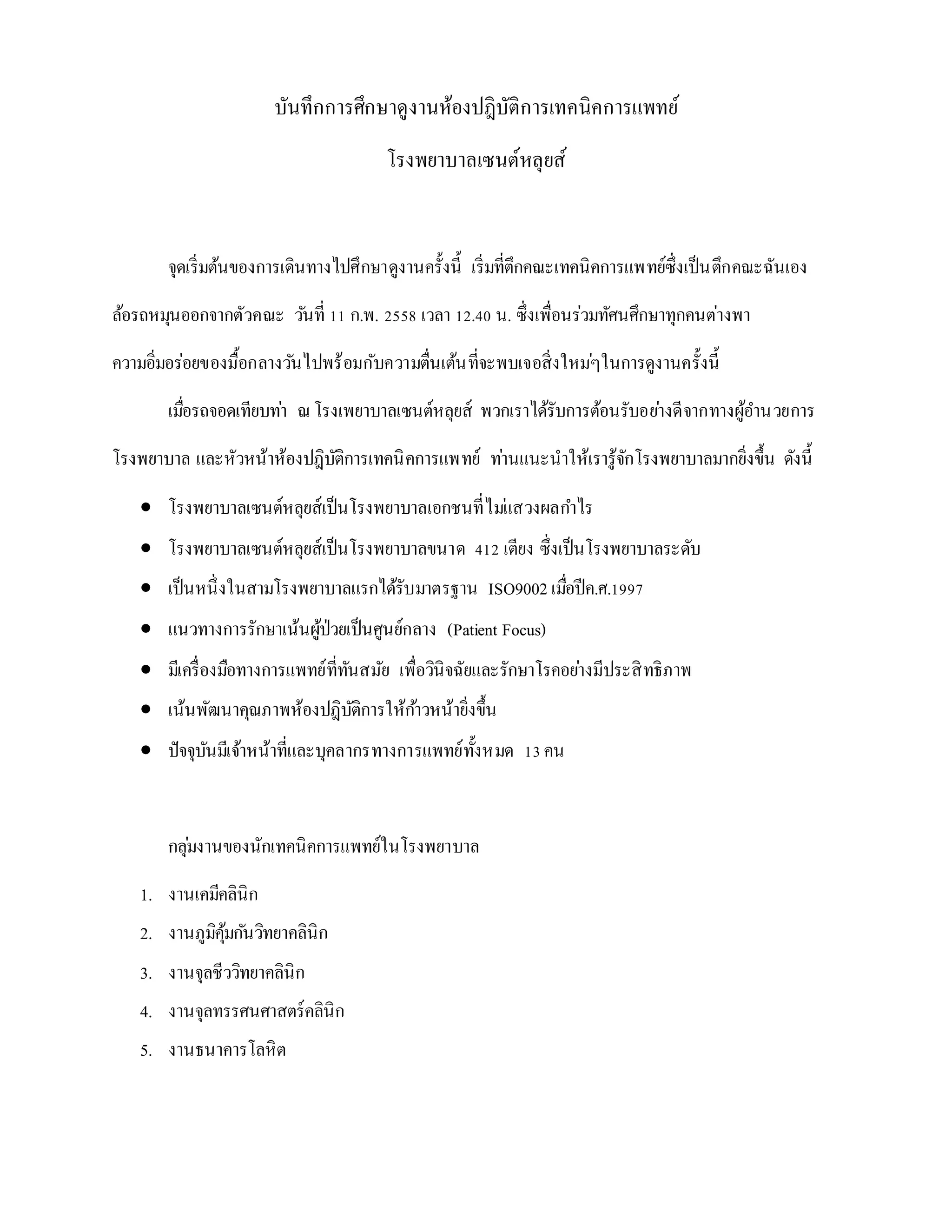 11 ก.พ. 2558 เวลา 12.40 น. ซึ่งเพื่อนร่วมทัศนศึกษาทุกคนต่างพา ความอิ่มอร่อยของมื้อกลางวันไปพร้อมกับความตื่นเต้นที่จะพบเจอสิ่งใหม่ๆในการดูงานครั้งนี้ เมื่อรถจอดเทียบท่า ณโรงเพยาบาลเซนต์หลุยส์ พวกเราได้รับการต้อนรับอย่างดีจากทางผู้อานวยการ โรงพยาบาล และหัวหน้าห้องปฎิบัติการเทคนิคการแพทย์ ท่านแนะนาให้เรารู้จักโรงพยาบาลมากยิ่งขึ้น ดังนี้ โรงพยาบาลเซนต์หลุยส์เป็นโรงพยาบาลเอกชนที่ไม่แสวงผลกาไร โรงพยาบาลเซนต์หลุยส์เป็นโรงพยาบาลขนาด 412 เตียง ซึ่งเป็นโรงพยาบาลระดับ เป็นหนึ่งในสามโรงพยาบาลแรกได้รับมาตรฐาน ISO9002 เมื่อปีค.ศ.1997 แนวทางการรักษาเน้นผู้ป่วยเป็นศูนย์กลาง (Patient Focus) มีเครื่องมือทางการแพทย์ที่ทันสมัย เพื่อวินิจฉัยและรักษาโรคอย่างมีประสิทธิภาพ เน้นพัฒนาคุณภาพห้องปฎิบัติการให้ก้าวหน้ายิ่งขึ้น ปัจจุบันมีเจ้าหน้าที่และบุคลากรทางการแพทย์ทั้งหมด 13คน กลุ่มงานของนักเทคนิคการแพทย์ในโรงพยาบาล 1. งานเคมีคลินิก 2. งานภูมิคุ้มกันวิทยาคลินิก 3. งานจุลชีววิทยาคลินิก 4. งานจุลทรรศนศาสตร์คลินิก 5. งานธนาคารโลหิต