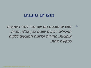 מוצרים מובנים הם שם גנרי לסלי השקעות המכילים רכיבים שונים כגון אג"ח, מניות, אופציות, סחורות וכדומה המוצעים ללקוח כמקשה אחת. מהרצאתו של פרופסור רפי אלדור תוכלו ללמוד בהרחבה מהם מוצרים מובנים ועל השימושים בהם כיום.