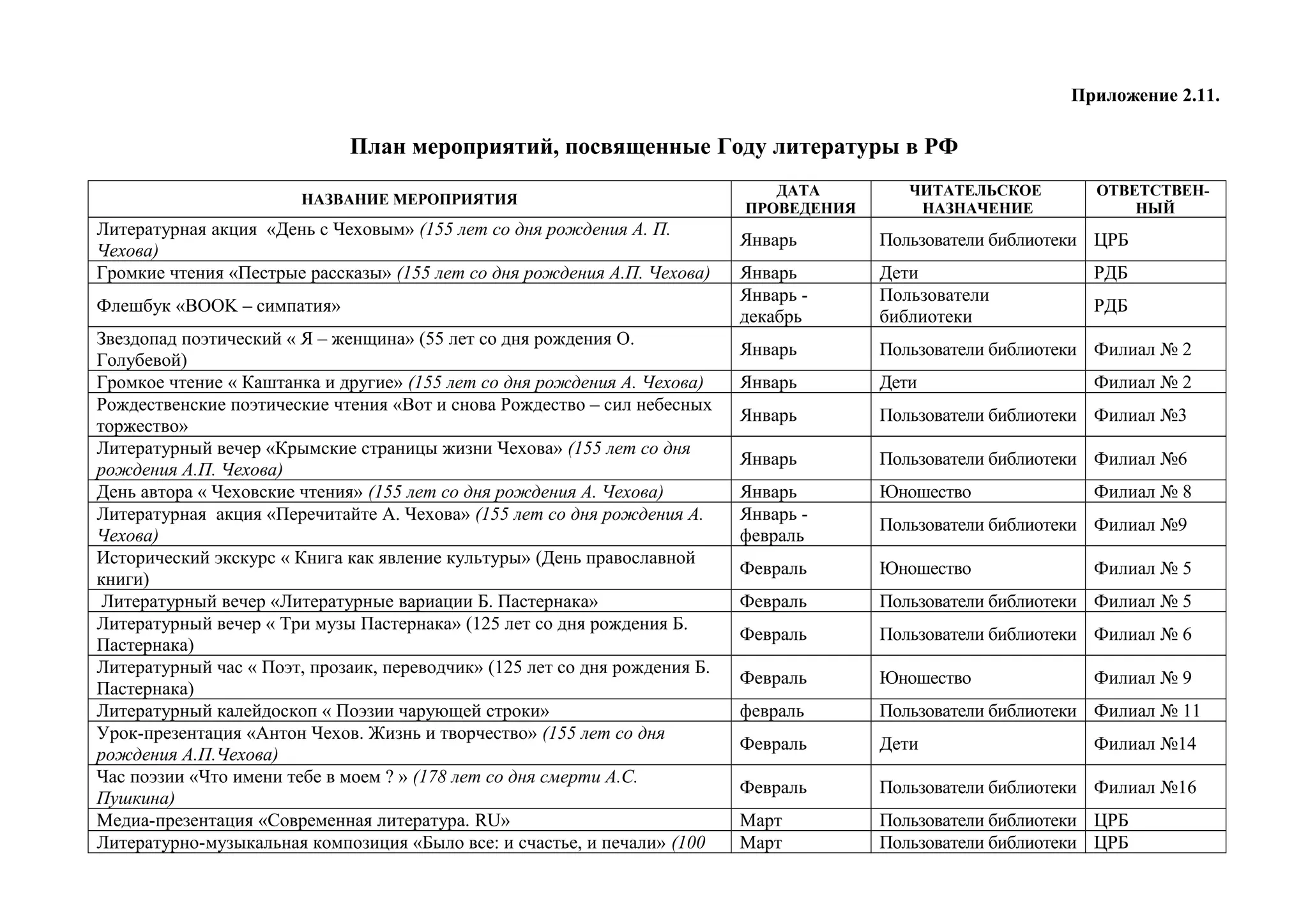 Документ представляет собой план мероприятий, посвященных году литературы в России, включая различные акции, чтения и встречи, запланированные на 2023 год. Основное внимание уделяется творчеству известных русских писателей, таких как А.П. Чехов и С.А. Есенин, с мероприятиями, ориентированными на различные возрастные группы и читателей библиотек. Мероприятия будут проводиться в библиотеках в течение всего года, начиная с января и заканчивая декабрем.