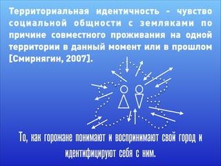 Документ рассматривает концепцию брендинга города и его связь с территориальной идентичностью, подчеркивая важность вовлечения местных жителей и анализа заинтересованных сторон. Описываются шаги по формированию успешного бренда города, включая создание уникального имиджа и поддержку местного сообщества. Также рассматриваются примеры из разных городов, где внедрение бренда направлено на улучшение восприятия территории и развитие инфраструктуры.
