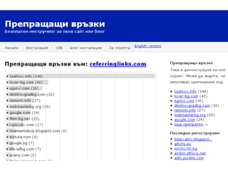 Принос Заданието ереализирано Сайт: referringlinks.com Уникална функционалност Форматиране на резултата Бързина и оптимизация Сигурност и надеждност Потребители до момента: 62
