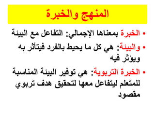 تتناول الوثيقة مفهوم الخبرة التعليمية وأهميتها للفرد من خلال استعراض أنواع الخبرات، وخاصة الخبرة المباشرة وتأثيرها في التعلم. تبرز الخبرة المباشرة فوائد متعددة مثل تعزيز الذاكرة والتفاعل الإيجابي وتقليل الشعور بالملل، مما يساهم في تطوير مهارات الفرد. كما تشير إلى التحديات والموارد المرتبطة بتنفيذ هذه الخبرات في السياق التعليمي.