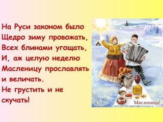 Документ описывает традиции и обычаи празднования Масленицы в России, включая значимые дни недели и их специфические занятия. Каждый день отмечен особыми мероприятиями, такими как встречи, угощения, игры и прощания с зимой. Завершается праздник сожжением куклы и надеждой на хороший урожай в следующем году.
