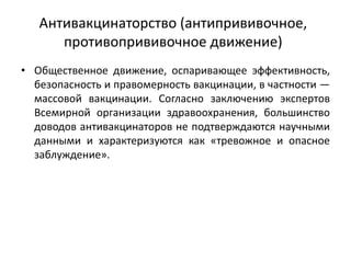 Документ рассматривает антивакцинаторство как общественное движение, оспаривающее эффективность вакцинации, и указывает на научные опровержения таких доводов. Он также охватывает историю вакцинации, начиная с вариоляции, и описывает достижения выдающихся ученых, таких как Эдвард Дженнер и Луи Пастер, в создании вакцин. Кроме того, документ предупреждает о последствиях массовых отказов от вакцинации, приводя примеры эпидемий и данных о смертности.