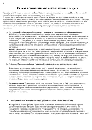 Документ обсуждает более 20 неэффективных и бесполезных лекарств, широко предлагаемых на российском фармацевтическом рынке, подчеркивая отсутствие доказанной терапевтической эффективности и критическую зависимость от рекламы. Многие из перечисленных препаратов, таких как актовегин и арбидол, не проходили необходимых клинических испытаний, что ставит под сомнение их применение в медицине. Автор акцентирует внимание на необходимости более строгого контроля и научных исследований для подтверждения эффективности лекарственных средств.