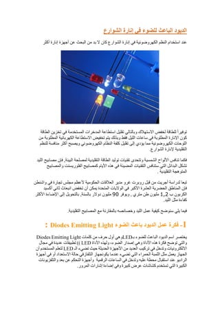 تتناول الوثيقة تقنية إنارة الشوارع باستخدام الديودات الباعثة للضوء (LED)، والتي تقدم مزايا كبيرة في توفير الطاقة مقارنة بالتقنيات التقليدية. تشير الدراسة إلى أن استخدام LED يمكن أن يقلل بشكل كبير من استهلاك الطاقة والانبعاثات الكربونية في المناطق الحضرية. توضح الوثيقة أيضًا كيفية عمل الديودات الباعثة للضوء وآليات توليد الضوء من خلال الإلكترونات في المواد شبه الموصلة.