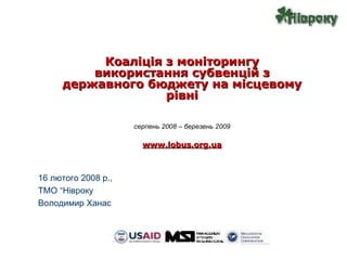 Коаліція з моніторингувикористання c убвенцій з державного бюджету на місцевому рівні серпень 200 8 – березень 2009 www.lobus.org.ua 16 лютого 2008 р., ТМО “Нівроку Володимир Ханас