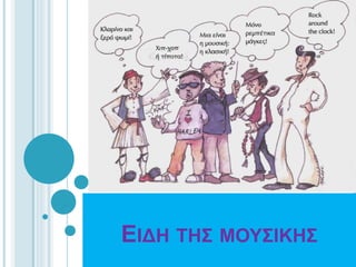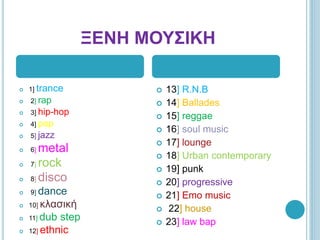The document categorizes different types of music into foreign music and Greek music. Under foreign music, it lists 23 genres including trance, rap, hip-hop, pop, jazz, metal, rock, disco, dance, classical, dub step, ethnic, R&B, ballades, reggae, soul music, lounge, urban contemporary, punk, progressive, emo music, house, and law bap. It then lists 9 genres of Greek music: rock, hip-hop, rap, pop, entekhno, laiki, rebetiko, enalaktiki, and paradosiaki.