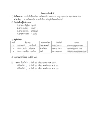 การยับยั้งเชื้อราดวยสารสกัดจากขา ( Inhibition fungus with Galangal Extraction) คําสําคัญ สารสกัดจากขาสามารถยับยั้งการเจริญเติบโตของเชื้อราได 2) ชื่อนักเรียนผูทําโครงงาน 1. นางสาว ป5ฐทิชา พูลทวี 2. นาย อดิศักดิ์ กอแกว 3. นาย กมลรัตนA แกวรรณา 4. นางสาววิจิตรา วงเวียน 3) ครูที่ปรึกษา คนที่ ชื่อ-สกุล สอนกลุมวิชา โทรศัพทA Email 1 นาย เดชมณี เนาวโรจนA วิทยาศาสตรA 0981049766 dnavaroj@gmail.com 2 นางสาว ยาใจ เจริญพงษA ชีวะวิทยา 0862506414 yajaicha@gmail.com 3 นางสาว แสงเดือน บกนอย เคมี 0872463509 saengduanbn@gmail.com 4) งบประมาณที่เสนอ 6,400. บาท 5) เสนอ ยื่นครั้งที่ 1 วันที่ 15 เดือน ตุลาคม พ.ศ. 2557 แกไขครั้งที่ 2 วันที่ 10 เดือน พฤศจิกายน พ.ศ. 2557 แกไขครั้งที่ 3 วันที่ 20 เดือน พฤศจิกายน พ.ศ. 2557
