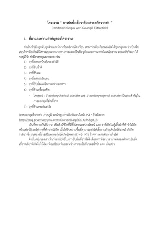 ” ( Inhibition fungus with Galangal Extraction) 1. ที่มาและความสําคัญของโครงงาน ขาเปYนพืชลมลุกที่ปลูกงายและมีมากในบริเวณโรงเรียน สามารถเก็บเกี่ยวผลผลิตไดทุกฤดูกาล ขาเปYนพืช สมุนไพรทองถิ่นที่มีสรรพคุณมากมายทางการแพทยAในป5จจุบันและการแพทยAแผนโบราณ ทางเภสัชวิทยา ได ระบุไววา ขามีสรรพคุณมากมาย เชน 1) ฤทธิ์ลดการบีบตัวของลําไส 2) ฤทธิ์ขับน้ําดี 3) ฤทธิ์ขับลม 4) ฤทธิ์ลดการอักเสบ 5) ฤทธิ์ยับยั้งแผลในกระเพาะอาหาร 6) ฤทธิ์ตานเชื้อจุลชีพ - โดยพบวา 1'-acetoxychavicol acetate และ 1'-acetoxyeugenol acetate เปYนสารสําคัญใน การออกฤทธิ์ฆาเชื้อรา 7) ฤทธิ์ตานเซลลAมะเร็ง (สารออกฤทธิ์จากขา ,ภาคภูมิ พาณิชยูปการนันทA(ออนไลนA) 2547 อางอิงจาก http://drug.pharmacy.psu.ac.th/Question.asp?ID=3785&gid=3) เปYนที่ทราบกันดีวา รา เปYนสิ่งมีชีวิตที่มีทั้งโทษและประโยชนA และ ราที่เกิดในตูเสื้อผาที่ทําจําไมอัด หรือเฟอรAนิเจอรAตางๆที่ทําจากไมอัด เมื้อไดรับความชื้นที่สามารถทําใหเชื้อราเจริญเติบโตไดรวดเร็วก็เกิด ราขียว ซึ่งราเหลานี้อาจเปYนพาหะกอใหเกิดโรคทางผิวหนัง หรือ โรคทางทางเดินหายใจได ดังนั้นกลุมของเราเห็นวาขามีฤทธิ์ในการยับยั้งเชื้อราไดจึงตองการที่จะนําขามาทดลองทําการยับยั้ง เชื้อราเขียวที่เกิดในไมอัด เพื่อเปรียบเทียบระหวางความเขมขนของน้ําขา และ น้ําเปลา