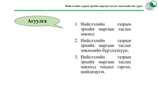 НИЙГМИЙН ЗАЙЛШГҮЙ ХЭРЭГЦЭЭГ ҮНДЭСЛЭН ГАЗАР ЧӨЛӨӨЛӨХ ЖУРАМ .pptx