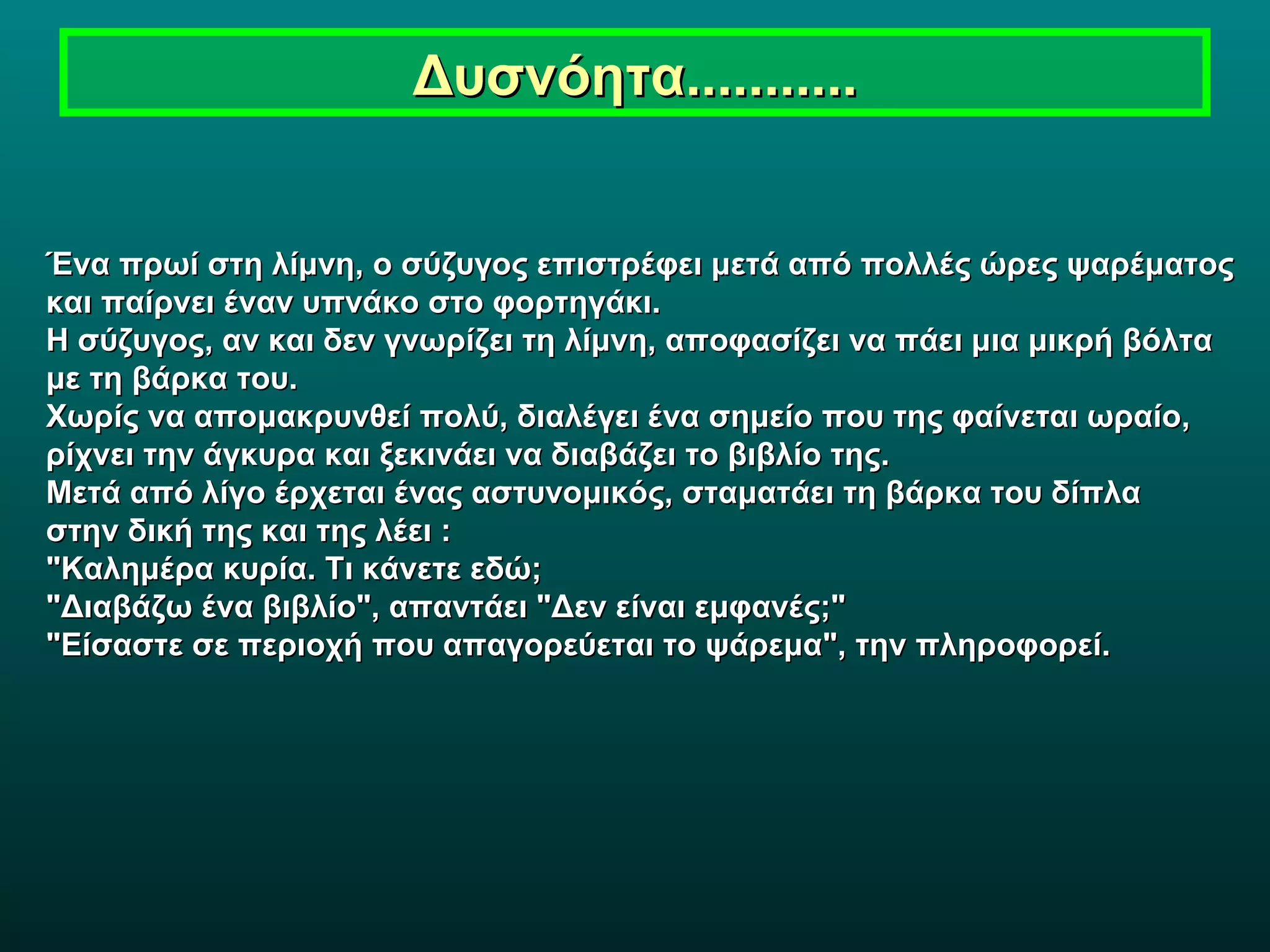 Δυσνόητα........... "Με συγχωρείτεκύριε αστυνόμε, του απαντάει, αλλά όπως βλέπετε δεν ψαρεύω, αλλά διαβάζω ένα βιβλίο. "Ναι, το βλέπω, αλλά είστε σε ψαράδικο σκάφος, οπότε έχετε όλον τον εξοπλισμό για να ξεκινήσετε οποιαδήποτε στιγμή. Με συγχωρείτε, αλλά πρέπει να με ακολουθήσετε στην ακτή και να σας γράψω ένα πρόστιμο." "Αν το κάνετε αυτό, θα πρέπει να σας μηνύσω για σεξουαλική παρενόχληση" "Μα, δεν σας έχω αγγίξει, δεν σας έχω καν πλησιάσει τόσο κοντά για κάτι τέτοιο!" Η γυναίκα απαντάει:" Ναι, το βλέπω , αλλά έχετε όλο τον εξοπλισμό για να ξεκινήσετε οποιαδήποτε στιγμή." "Καλή σας μέρα κυρία μου!" απαντάει ο αστυνομικός και φεύγει.