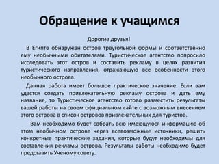 Проектная задача 'Необычный остров' предлагает учащимся исследовать треугольный остров в Египте и разработать рекламу для туристического агентства. Задачи включают изучение климатических данных, предложения активного отдыха и создание рекламного текста от лица обитателей острова. Результаты работы будут представлены ученому совету и могут быть опубликованы на официальном сайте агентства.
