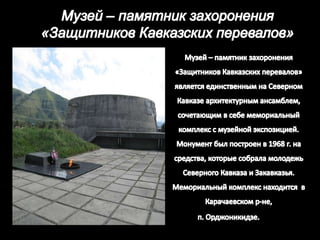 Документ описывает мемориалы, посвященные погибшим защитникам Отечества, включая их расположение и архитектурные особенности. Упоминаются несколько памятников, таких как мемориал в Архызе и мавзолей неизвестного солдата, подчеркивающие важность сохранения исторической памяти. Особое внимание уделяется развитию этих мемориалов и их значению для общественности.