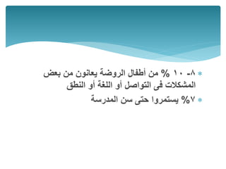 تتناول الوثيقة مشاكل النطق واللغة والتواصل لدى الأطفال، موضحة أن 8-10% من أطفال الروضة يعانون من صعوبات في هذه المجالات. تتضمن الوثيقة أيضًا تفاصيل عن مكونات اللغة مثل التركيب والمعاني والأصوات، وكيف تؤثر العوامل المختلفة على تطوير المهارات اللغوية لدى الأطفال.