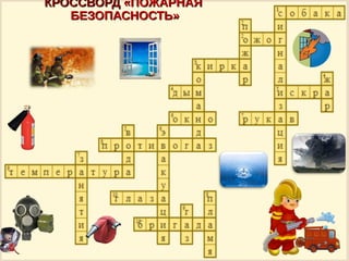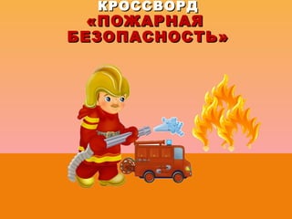 Документ представляет собой кроссворд на тему пожарной безопасности с вопросами по горизонтали и вертикали, связанными с профессией пожарного и средствами тушения огня. Также включены стихи о мужестве пожарных и описание рисков, связанных с их работой. В конце документа приведены использованные ресурсы для иллюстраций и стихотворений.