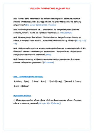 Документ содержит логические задачи, связанные с обыденными ситуациями, такими как деление ресурсов и счёт. Задачи охватывают различные сценарии, включая распределение ножек стульев, шаги на лестнице, и количество яблок, оставшихся после еды детьми. Также присутствуют культурные элементы, например, японский счёт и терминология, связанная с украинской валютой.
