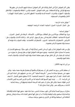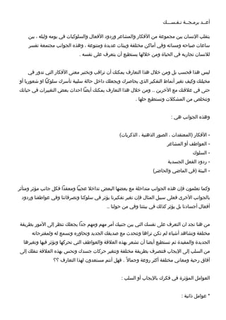 تناقش الوثيقة أهمية التعرف على الذات وتأثير الأفكار والمشاعر والعواطف والسلوكيات على حياة الإنسان، وكيفية التعامل مع الجوانب السلبية لتحسين نوعية الحياة. تؤكد على ضرورة تغيير البرمجة السلبية إلى إيجابية من خلال المراقبة الذاتية والتفكير الإيجابي، مما يسهم في تحقيق الأهداف والطموحات. وتذكر العوامل الذاتية والمادية والعلاقات التي تؤثر على الفكر الإيجابي أو السلبي.