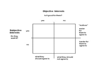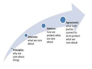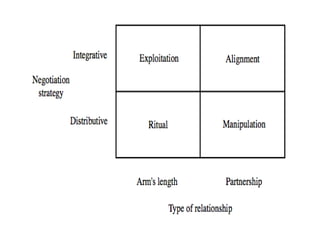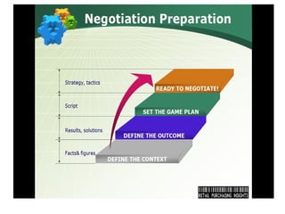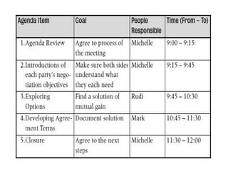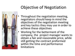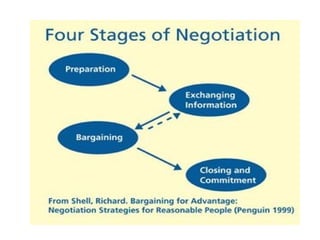The document provides an overview of key objectives and phases in a negotiation process. It discusses the importance of thorough preparation before negotiations, including understanding the other party's needs and determining your own objectives and bargaining positions. During negotiations, it recommends establishing trust, making gradual concessions, and finding solutions that satisfy both sides. It also emphasizes the importance of putting all agreements in writing. After negotiations, it suggests evaluating the results and maintaining feedback from all involved parties.